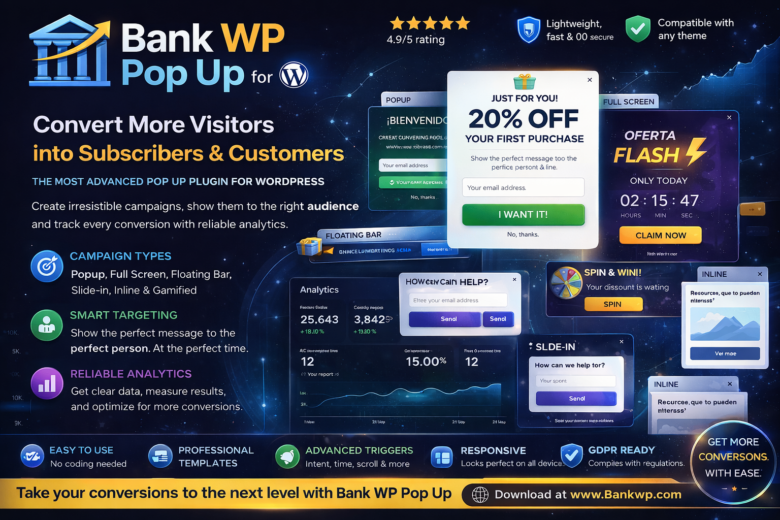 Designed for performance and flexibility, Bank WP Pop Up works seamlessly with any WordPress theme.